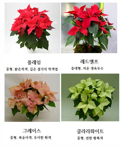 최근에는 품종 개량에 의해 가꾸기도 쉬워지고 종류도 많아졌습니다. 포인세티아는 꺾꽂이로 번식시킬 수 있어서 4월 중순에 전에 피었던 붉은 잎 부분을 잘라 내면 6월 중순부터 꺾꽂이 싹을 얻을 수 있습니다. 꺾꽂이 모판은 버미큘라이트와 펄라이트를 반반씩 섞은 것이 좋으며, 가지 끝 부분을 6-7cm 길이로 잘라 자른 부분을 물에 담갔다가 2-3cm 깊이로 꽂아 9월 중순쯤 잎 4-5장을 남기고 순지르기를 하면 3-5개의 곁가지가 나옵니다.